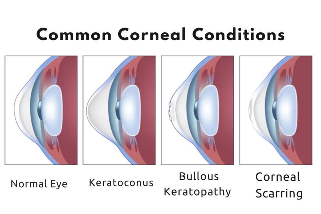- Keratoconus – Progressive thinning of the cornea, leading to distorted vision.
